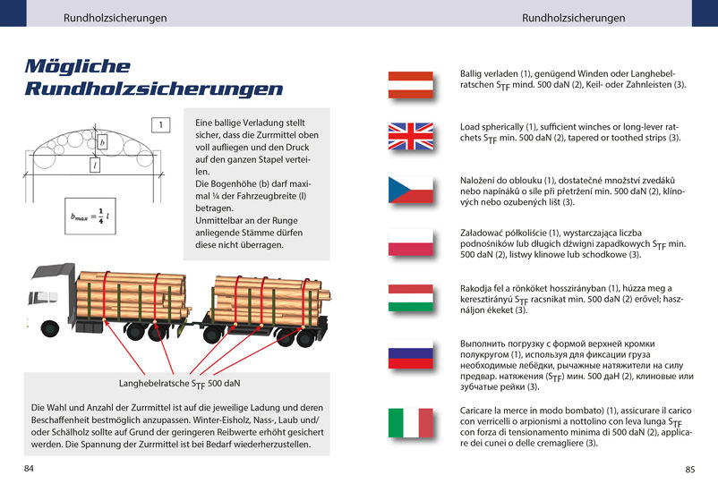 Alle wichtigen Sicherungsarten sind in 6 Sprachen übersetzt, die von ausländischen Fahrzeuglenkern effektiv genutzt werden können. Themen wie z.B. der Holz- und Papiertransport, der Bereich Kleintransporter oder die Sicherung von Absetzbehältern unterstützen alle Beteiligten auch bei diesen Spezialgebieten.