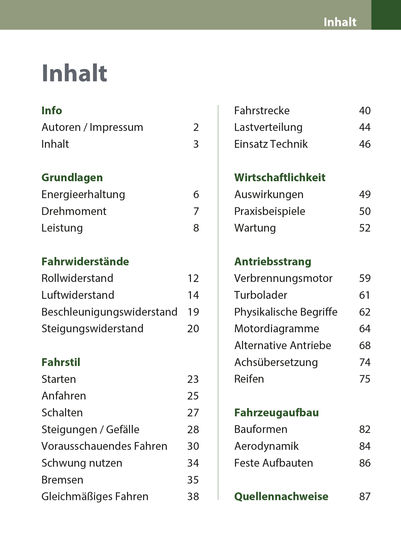 Physikalische Grundlagen rund um den LKW werden ausführlich erklärt. Zahlreiche Methoden wie die effektive Umsetzung des Drehmoments, Roll- und Luftwiderstand, richtiges Schalten, vorausschauendes Fahren und der optimale Reifendruck werden genau erläutert. Diese Tipps können jederzeit im täglichen Einsatz umgesetzt werden und helfen somit die Betriebskosten zu senken.
